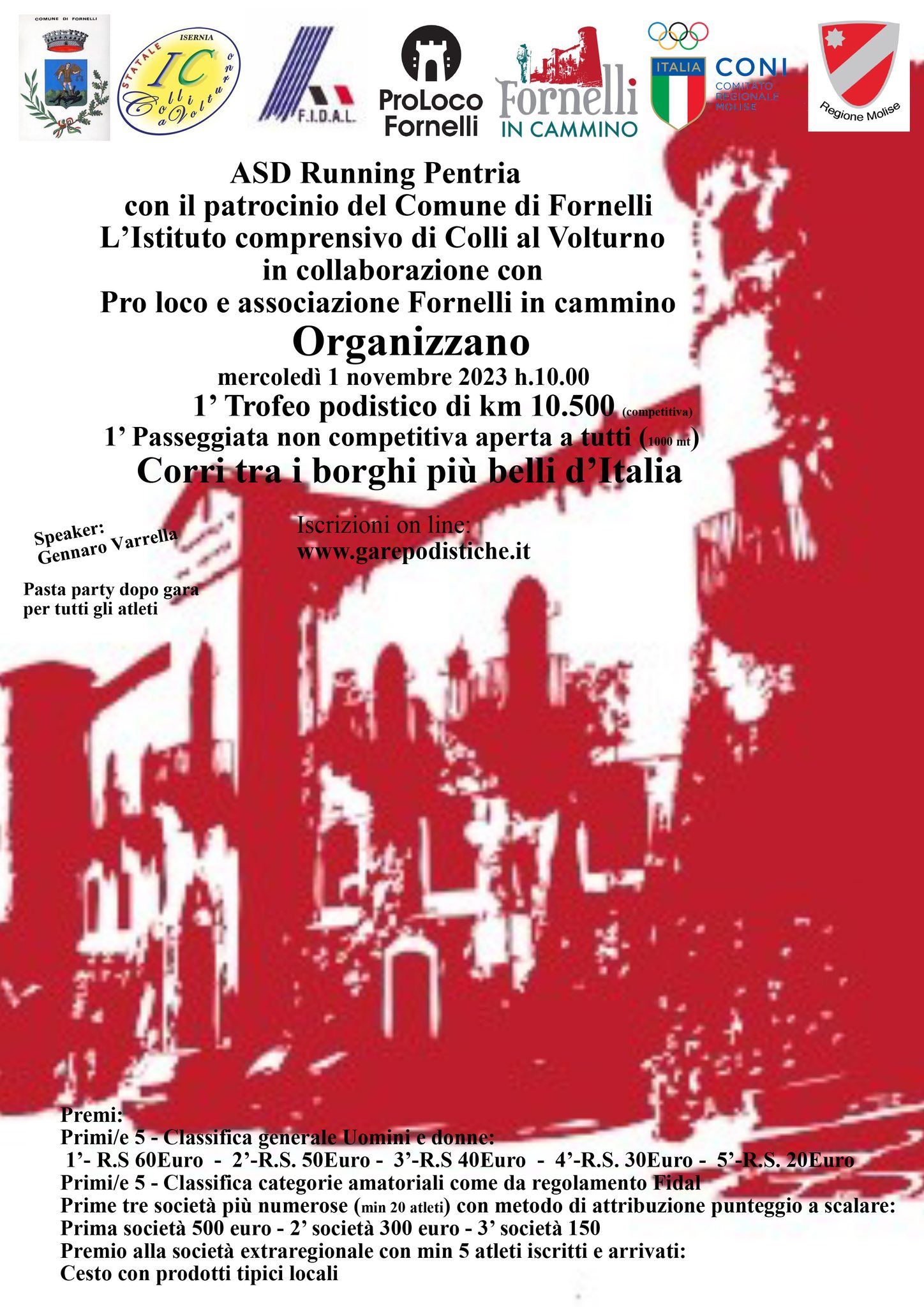 L'Asd Running Pentria con il patrocinio del comune di Fornelli e dell'Istituto Comprensivo di Colli a Volturno e con la collaborazione dell'Associazione "Fornelli in Cammino" e della Pro Loco Fornelli, propone il primo trofeo podistico sulla distanza di Km 10.500.